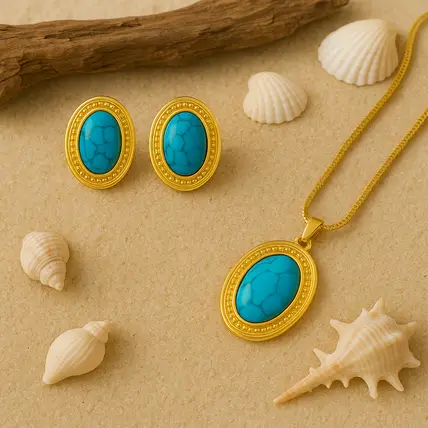 Turquoise-Oval-Pendant-18K-Gold-Plated-Necklace-Stud-Earrings