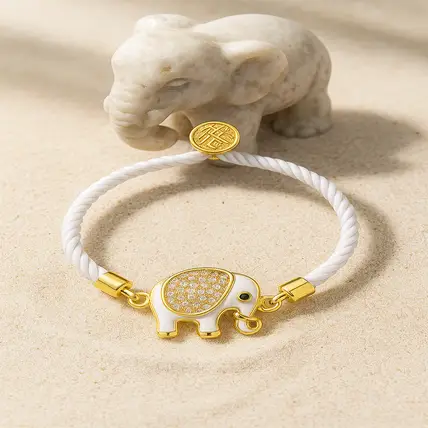 White-Cord-Elephant-Charm-18K-Gold-Plated-Bracelet-